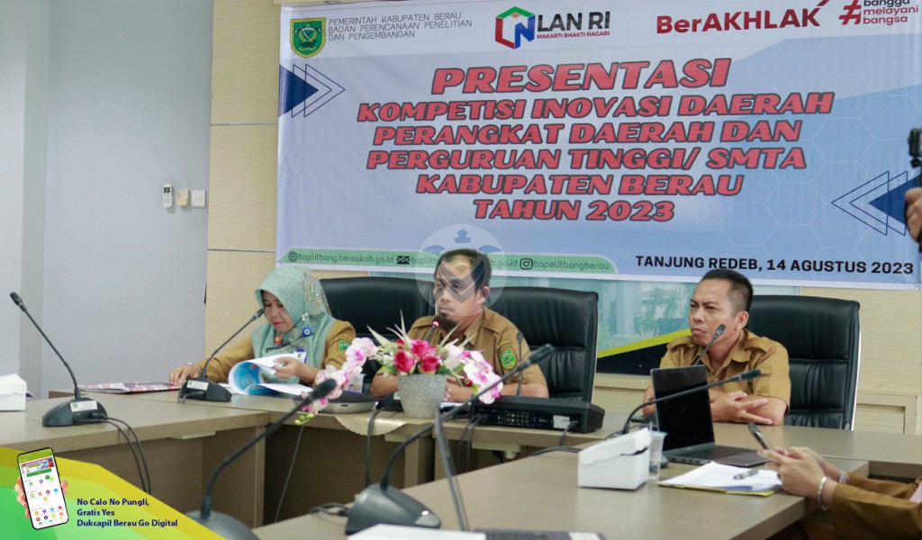 Presentasi ini dilaksanakan di ruang RKPD Bapelitbang Kabupaten Berau dan hadir secara virtual zoom tim juri dari kemendagri, LAN prov, Balitbangda prov, UGM jogja dan Bapelitbang kab berau,