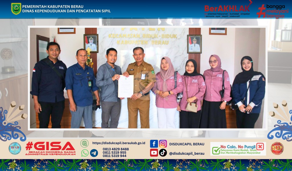 Dinas Kependudukan dan Pencatatan Sipil (Disdukcapil) Kabupaten Berau melanjutkan komitmennya untuk mendekatkan layanan administrasi kependudukan (Adminduk) kepada masyarakat. Pada tanggal 25 November 2025, bertempat di Kantor Kecamatan Biduk-Biduk, tim Disdukcapil melaksanakan kegiatan koordinasi sekaligus penandatanganan Perjanjian Kerjasama (PKS) SIAK OTW (Sistem Informasi Administrasi Kependudukan On The Way) Kecamatan.