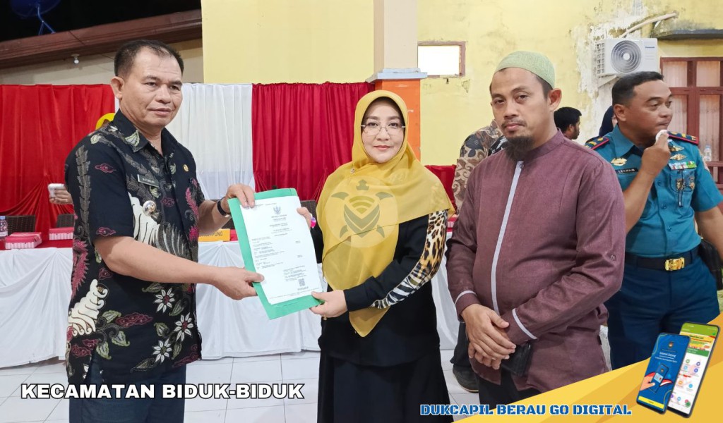 SelengkapnyaPenyerahan Akta Kematian Petugas Pemilu yang meninggal dunia di Kampung Giring-Giring diserahkan langsung oleh Bupati Berau di dampingi Kadisdukcapil Berau kepada ahli waris diwakili oleh Camat Biduk-Biduk sebelum acara Musrenbang